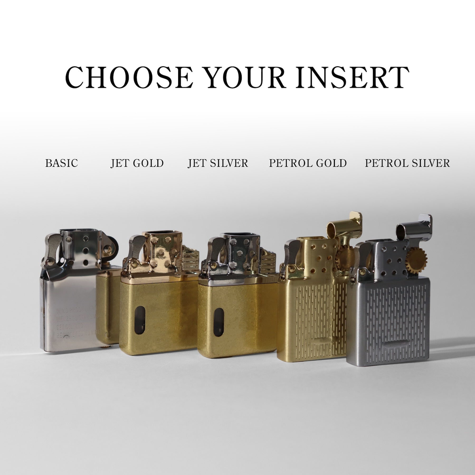 Lastly, our collector’s petrol inserts in silver or gold offer a heavier, elegant feel while keeping the classic petrol mechanism — must be fueled with petrol lighter fluid (same as the basic insert).